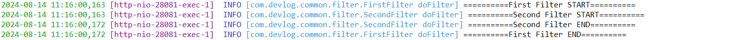 필터 체이닝에 의해 순차적으로 실행되고 요청이 끝난 후 역순으로 종료되는 것을 확인할 수 있다.