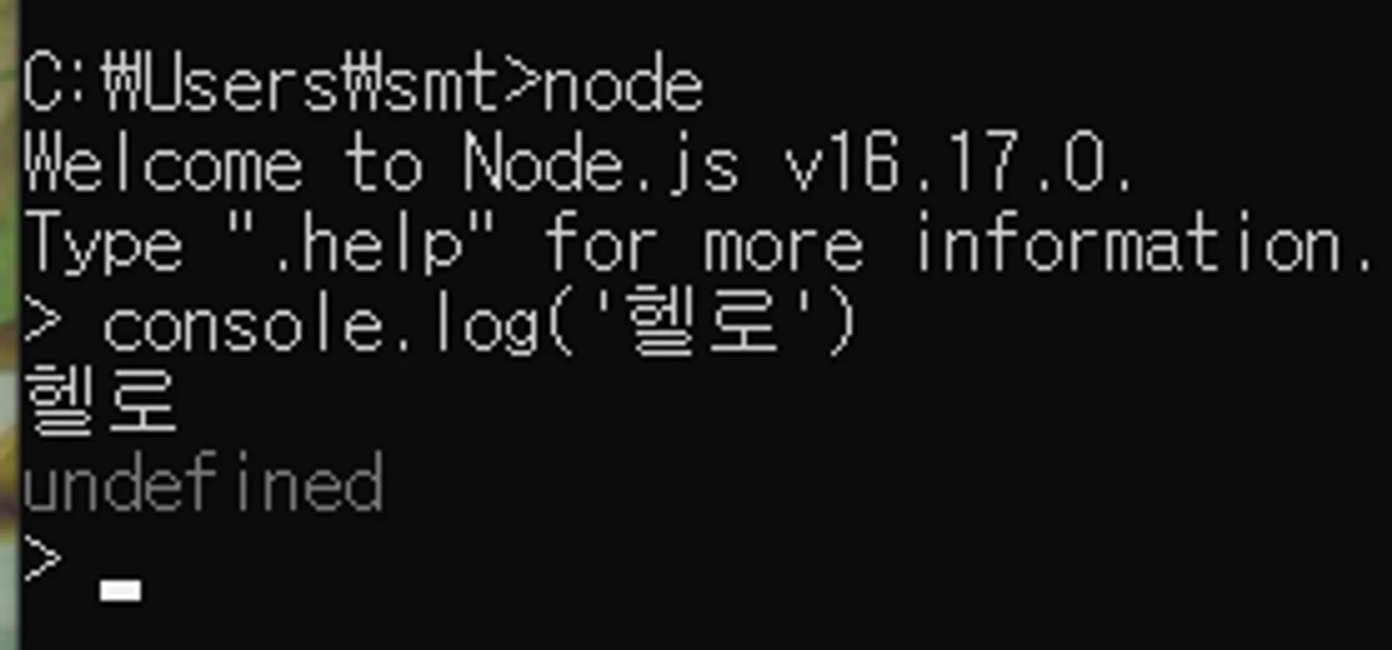 Node.js설치 후 명령 프롬프트(CMD)에 node 실행 후 console.log(”xxx”)를 출력해 보자.